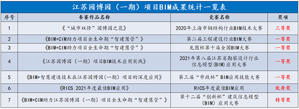 其中江蘇園博園(一期)項(xiàng)目榮獲“龍圖杯”國(guó)家級(jí)BIM成果1項(xiàng),“上海市BIM大賽”等省部級(jí)BIM成果6項(xiàng)。