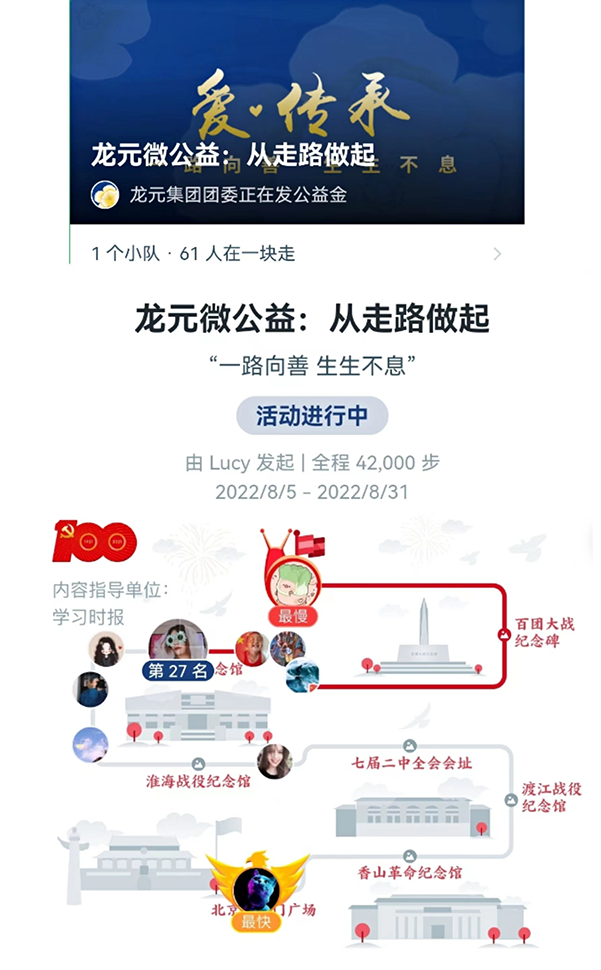 85日,集團(tuán)團(tuán)委發(fā)起“龍?jiān)⒐妫簭淖呗烽_(kāi)始”公益捐步活動(dòng),重走紅色旅游地圖。此項(xiàng)活動(dòng)將黨史學(xué)習(xí)教育、互聯(lián)網(wǎng)公益及企業(yè)文化緊密結(jié)合,創(chuàng)新活動(dòng)形式,鼓勵(lì)龍?jiān)獔F(tuán)員青年積極參與。捐步活動(dòng)所產(chǎn)生的所有善款將專(zhuān)項(xiàng)用于“一億顆梭梭樹(shù)”項(xiàng)目,在阿拉善盟地區(qū)種下綠植,為助力“碳中和”貢獻(xiàn)龍?jiān)啻毫α俊?/span>