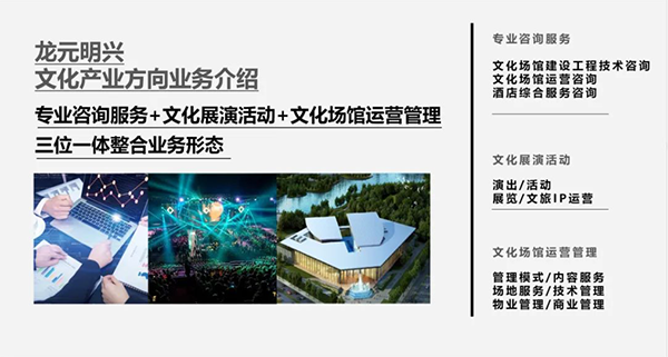 龍元明興作為專業的城市運營服務商,充分發揮專業能力、整合各類資源,依托龍元建設集團在國內領先的PPP業務優勢,聚焦文化、體育、會展等專業場館的運營。其中在文化產業方向以劇院管理為核心,以優質文化產品投資運營、高品質物業管理和特定場景商業運營為保障,通過多元化的運營模式和先進的管理體系,提供集場館建設咨詢、運營管理、演出活動運營、場景商業運營為一體的綜合城市文化服務。