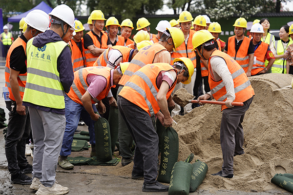 本次應(yīng)急演練活動(dòng)分為防汛排澇應(yīng)急演練比武和消防滅火應(yīng)急演練兩部分。防汛排澇應(yīng)急演練比武內(nèi)容為在兩地塊的車庫(kù)坡道口分別堆筑50厘米高度的阻洪堤,利用抽水設(shè)備進(jìn)行排澇,用時(shí)最短的即為優(yōu)勝隊(duì)伍。六支參賽隊(duì)伍齊心協(xié)力,裝沙包、運(yùn)沙包、堆沙包、排澇......現(xiàn)場(chǎng)加油和沖刺聲此起彼伏。